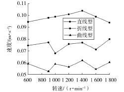 通過離散元模擬,得出在不同轉(zhuǎn)速下的 3 種不同螺 旋葉片形狀對平均周向速度的變化趨勢,如圖 6 所示。