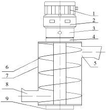 1.電動機,2.減速器,3.機座,4.上軸承座,5.出料口, 6.螺旋葉片,7.殼體,8.進料口,9.下軸承座